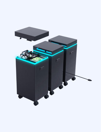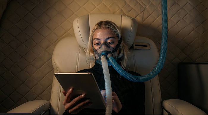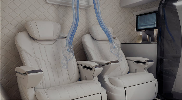 Oxygenation System. Medical-grade oxygen for two, simultaneously. Dual-core generators deliver 40L/min at 90%+ purity with independent breathing pathways that eliminate CO₂ buildup.